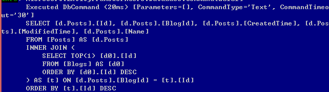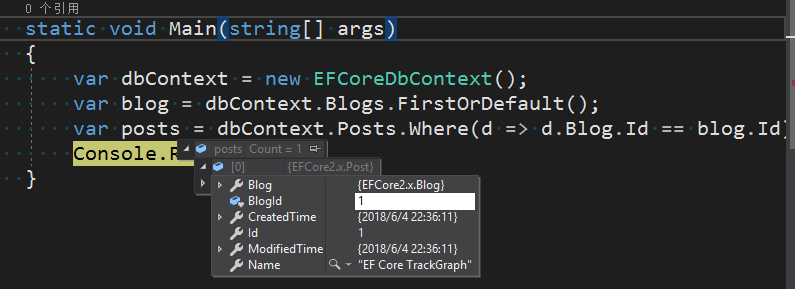 }接下来我们进行如下查询,我们能够看到此时并未利用Include显式加载Posts,通过如下查询EF Core内部会进行关系修正从而查询出Posts。