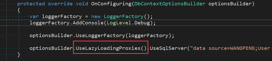 options.UseLazyLoadingProxies().UseLoggerFactory(loggerFactory).UseSqlServer("data source=WANGPENG;User Id=sa;Pwd=sa123;initial catalog=EFCore2xDb;integrated security=True;MultipleActiveResultSets=True;");