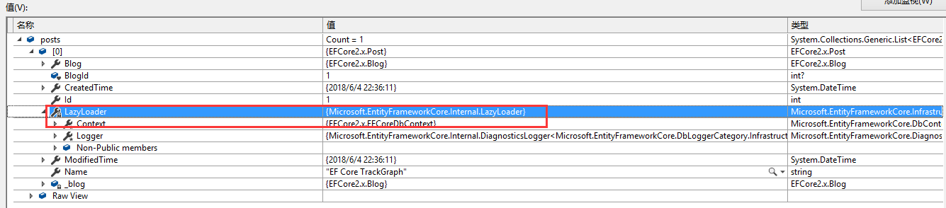 }通过如上注入ILazyLoader服务依附于实体上最终实现延迟加载,这么做对于启用延迟加载代理的最大好处在于只针对特定实体进行延迟加载,而使用延迟加载代理则是全局配置,所有实体都必须通过virtual关键字修饰且都会实现延迟加载。同时呢,通过如下图可知,此时ILazyLoader依附在上下文中也就是说一旦创建实体实例将实现延迟加载。