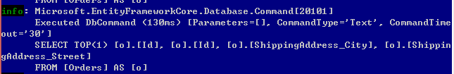 我们从如上图生成的SQL得知:对于复杂属性即通过OwnOne配置的复杂属性在查询时,EF Core会一次性将复杂属性值全部返回(也就是说复杂属性值总是会加载),所以对于启用延迟加载不会起到任何作用,即使是通过Include进行显式加载都是多此一举。