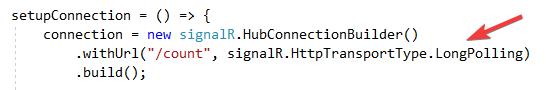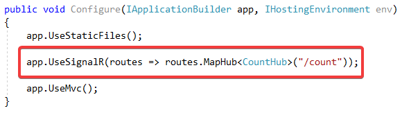 然后在管道里使用SignalR, 使用app.UseSignalR():