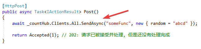 接下来我们就可以使用IHubContext<CountHub>这个对象与客户端进行实时通信了.