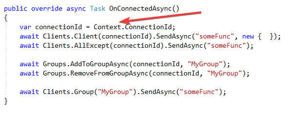 在Hub类里, 我们可以访问到Context属性. 从Context属性那, 我们可以获得一个常用的属性叫做ConnectionId. 这个ConnectionId就是连接到Hub的这个客户端的唯一标识.