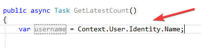 想要取得User对象, 需要使用Context.User, 它的类型是ClaimsPrinciple: