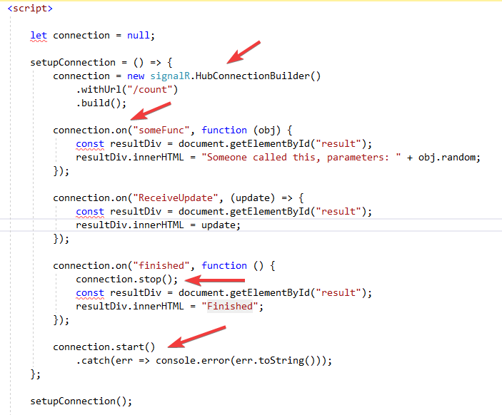 使用singalR对象的HubConnectionBuilder来构建connection. 使用返回的connection对象, 我们可以用它的on方法来处理服务器端方法调用的响应. 响应方法的参数可以是简单类型也可以是复杂的对象.