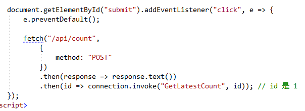 点击按钮后先执行Controller的POST方法, POST返回的是Accepted(1), 所以id是1.
