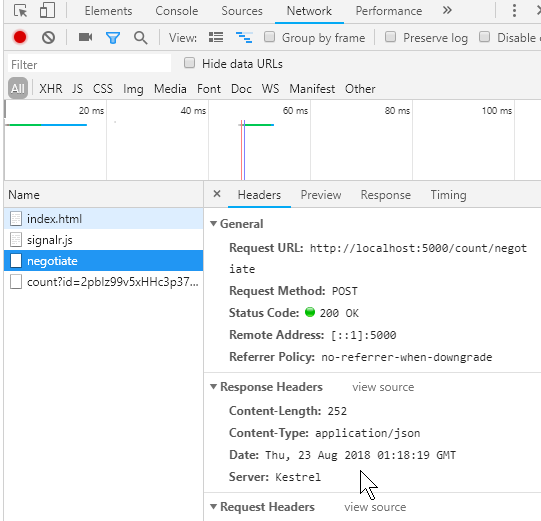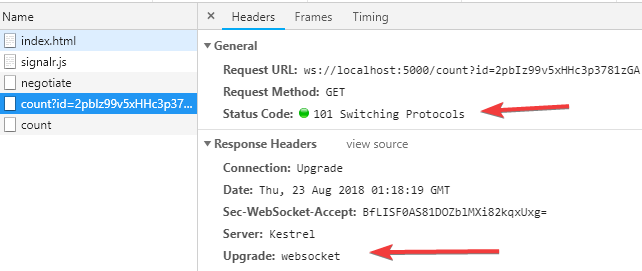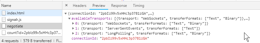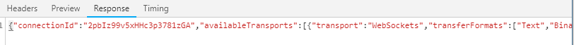 响应也包含着connectionId, 以及服务器支持的传输方式. 这里三种都支持. 由于我没有指定传输方式, 所以SignalR选择了最好的方式: websocket.